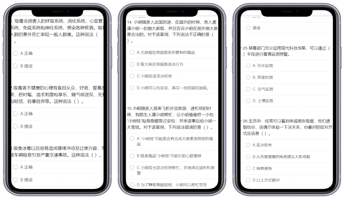 我院在主题教育期间推送各年级完成禁毒主题知识问答,内容丰富、形式多样的题目囊括了毒品的种类、我们该如何防范毒品的侵害、发现身边人接触毒品我们该怎么做等多个方面,教导同学们在日常生活中如何应对多种突发情况。同学们依据主题教育中所学知识的各类知识进行答题,这既是对知识的总结,也能加深对禁毒相关认知和形势的理解。