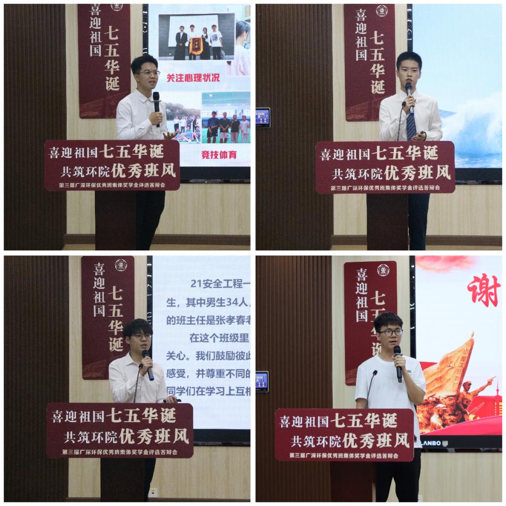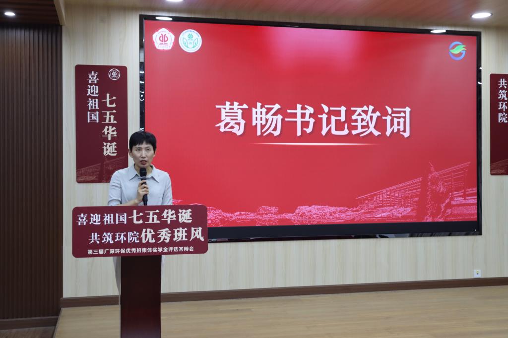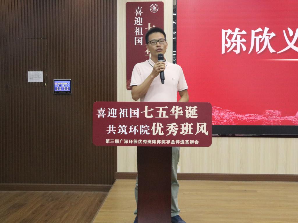 为充分发挥优秀班集体的引领示范作用,激发学生的“主人翁”精神和集体荣誉意识,推动我院良好院风学风建设,以大学生良好的精神面貌迎接本科教学审核评估工作,以青年人的昂扬之姿献礼祖国,5月17日,我院在工学三号馆208举办以“喜迎祖国七五华诞,共筑环院优秀班风”为主题的第三届广深环保优秀班集体奖学金评选活动。学院党委书记葛畅、校友广东广深环保股份有限公司陈欣义总经理、学院校友会会长宁寻安、班主任老师代表以及各班学生代表共两百余人参加本次评选答辩会。