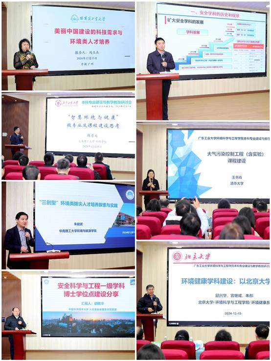 哈尔滨工业大学冯玉杰教授,大连理工大学陈景文教授,华南理工大学朱能武教授,中国科技大学胡隆华教授,中国矿业大学秦波涛教授,清华大学王书肖教授,北京大学邱兴华教授分别就“美丽中国建设的科技需求与环境类人才培养” ,“智慧环境与健康微专业及课程建设思考”,“三创型环境类拔尖人才培养探索与实践”,“安全科学与工程一级学科博士学位点建设”,“中国矿业大学安全科学与工程学科及专业建设”,“大气污染控制工程(含实验)课程建设”以及“环境健康学科建设:以北京大学为例”进行报告。
