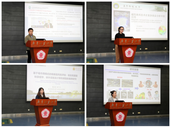 接着,陈江耀教授主持会议,谭磊主任技师、于希副教授、徐飞飞博士和bevictor伟德官网彭灵慧副教授分别以“基于人体生物监测的农药暴露与健康研究”、“磁性纳米技术在复杂食品分析中的应用”、“基于毒作用模式的镉暴露风险评估:结合高通量转录组学、体外实验及计算机模型的案例研究”和“垃圾处理过程生物气溶胶的健康风险与仿生控制技术研究”为主题做了系统性的学术报告。