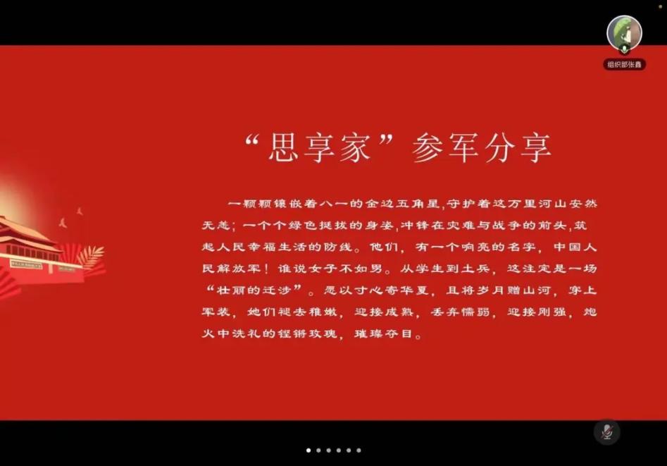 为加深同学们对军旅生活的了解,激发同学们参军入伍的热情,安全工程学生党支部于4月17日上午在线上举办了一场以“筑梦军旅,无悔青春”为主题的“思·享·家”沙龙活动。由原17级,现19级安全工程(1)班的陈俊珊和曾楚萍两位退伍同学进行参军分享,18级辅导员张建岗一同参会。