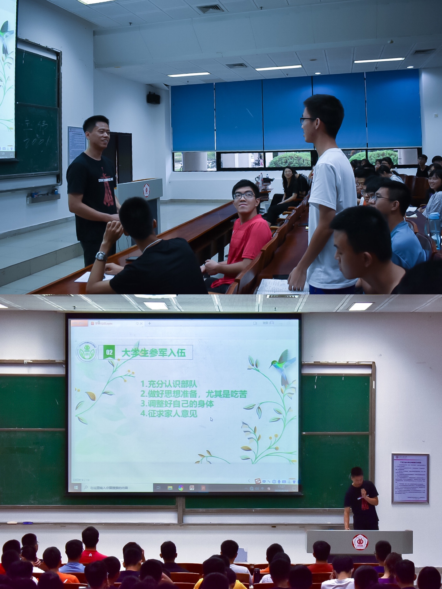 9月18日,学院邀请到11级校友王庆琳,王庆琳介绍了其大三之后选择当兵的由来、当兵的过程、复员后的调整、选择深造后的艰辛再到接下来即将奔赴法国开启攻读博士的新旅程,让在场新生对选择当兵有了更形象的认知。校友王庆琳非常赞同“当兵后悔两年,不当兵后悔一辈子”这句话,他指出在当兵的日子会让他回望过去三年的大学生涯有什么不足,能够让自己静下心来思考要怎么改正不足,确定自己的人生方向,而当兵过程中磨练出来的坚毅品质也让他在面对未来的升学、生活、科研、工作起着至关重要的作用。分享会场反响热烈,有效引导新生树立参军光荣的意识,结束后部分同学主动联系辅导员要征兵资料,表态要响应号召,参军入伍。