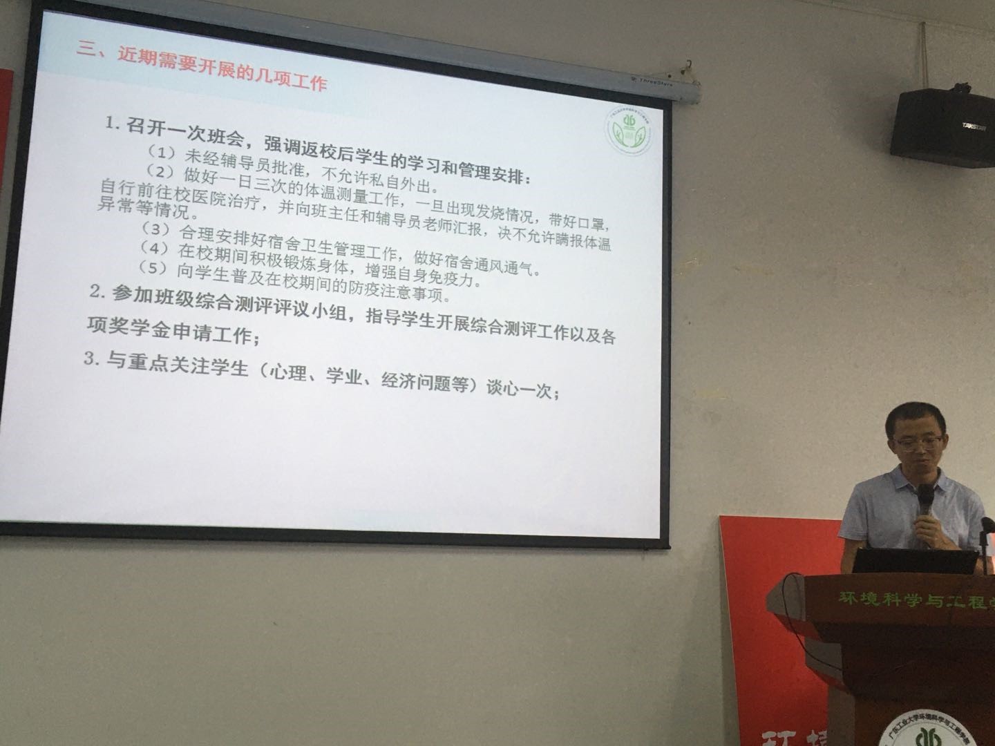 会上,团委书记张建岗解读了班主任职责和要求,希望班主任在返校后关心关爱学生,指导学生开展疫情防控主题班会、综合测评和贫困认定等工作,切实做好疫情防控工作。