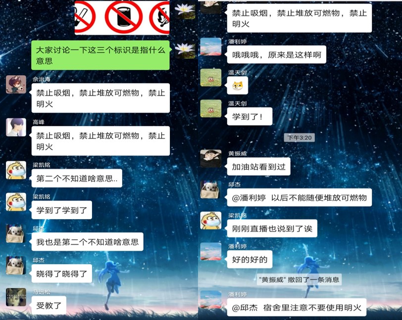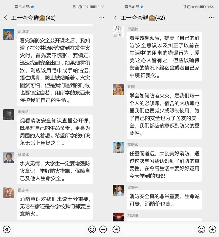各班同学在看完视频后纷纷在线上讨论消防公开课的相关内容。“观看消防安全知识直播公开课,既是对自己的生命负责,更是为周围的人着想。希望所学的知识永无派上用场之日。”环境科学与工程类19(1)班李奕晗同学如是说。环境科学与工程类19(4)班的同学们对公开课所讲的在宿舍违规使用大功率电器、乱丢杂物等而导致的安全隐患感触良多,纷纷发表自己的看法,班长郭淑林还设置了有关消防安全标识的问题供同学们回答。