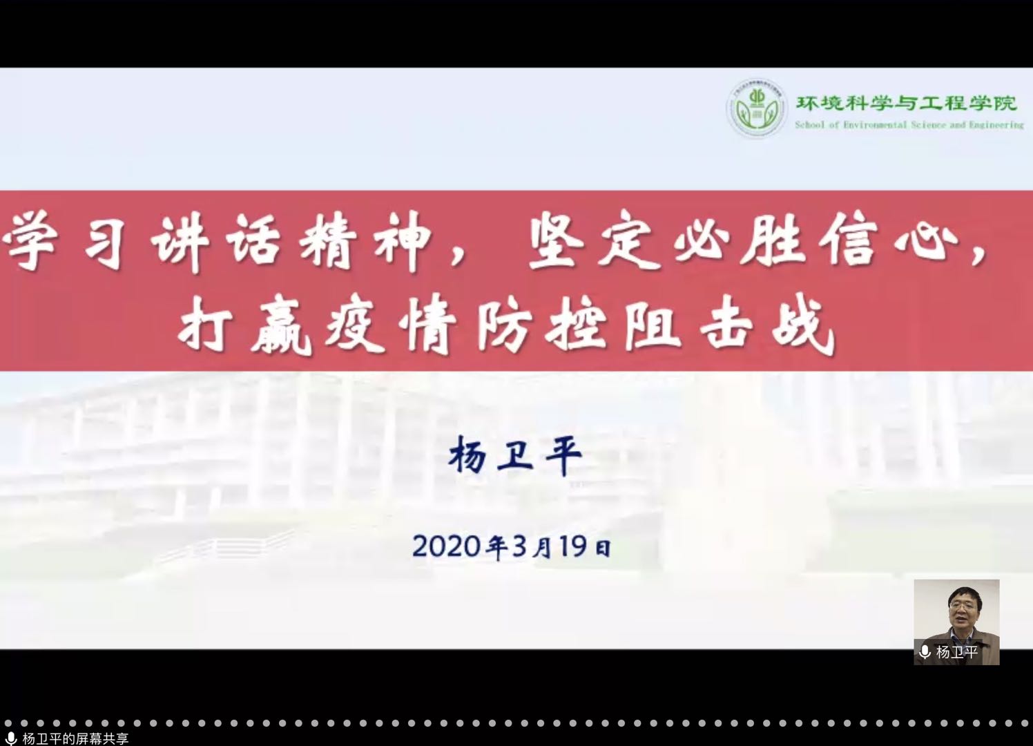 3月13日下午,我院使用腾讯会议线上平台开展以“坚决打赢新型冠状病毒肺炎疫情防控阻击战”为主题的学习活动。学院教工党支部书记、办公室党支部、全体研究生党支部及教工入党积极分子参与学习,学院党委书记杨卫平担任主讲。杨书记带领大家学习习近平总书记抗疫的重要讲话精神,讲述了党中央的正确决策和有力部署,并强调党员同志要学习无私奉献的精神,遵守网络行为规范。