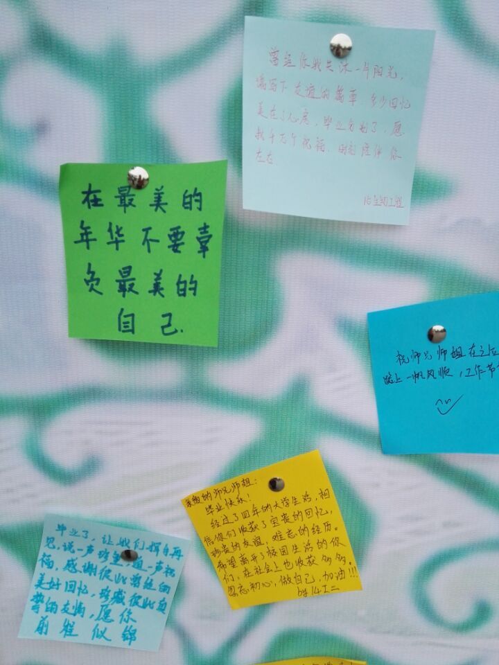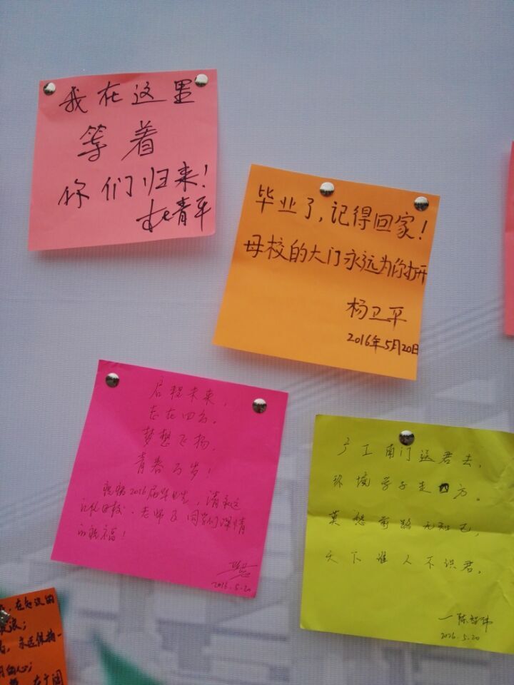 学校、学院领导老师、低年级的同学们在祝福墙上表达了对2016届毕业生的美好祝愿和期盼,学生处刘琼辉副处长祝“扬帆起航、放飞梦想”,罗嘉文副处长祝大家“鲲鹏展翅、前程锦绣”,低年级的同学写下了“在最美好的年华不辜负自己”,杨卫平书记希望同学们“不管大家今后走的多远,母校永远是同学们温暖的港湾,希望同学们能常回来看看”。