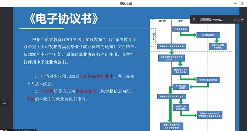随后,王老师介绍了广东大学生就业创业小程序,说明了三方协议的申请流程和使用规范,详细总结了毕业生如何更新个人生源信息、违约金的赔付合理范围、回传三方协议规范及三方协议生效时间和流程等要点。