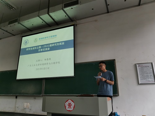 我院一直重视研究生深造与就业工作,为了进一步提高研究生的就业意识、引导未来发展方向,2021年5月13日,环境科学与工程学院召开了2022届研究生就业交流分享会。我院2021届毕业生代表宋玥瑶(清华大学读博)、邹惠煌(同济大学读博)、潘圳钟(东莞市寮步人民政府就业)、罗嘉铭(湛江市生态环境局坡头分局就业)、王超(广东粤港供水有限公司就业)、甘涛(广州市城市规划勘测设计研究院就业)、毛星晨(中国电建集团昆明勘测设计研究院有限公司-市政规划设计研究院就业)、仇智霖(深圳市宝安排水有限公司就业)、廖盼(深圳市宝安排水有限公司就业)、包炳钦(睿安集团-销售岗就业)同学参与分享,各年级研究生积极参加,会议由邹惠煌同学主持。