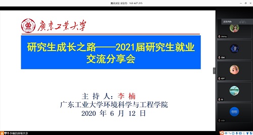 我院一直重视研究生深造与就业工作,为了进一步提高在读研究生的就业水平和竞争力,提高同学们的就业意识、引导未来发展方向。2020年6月12日,我院在线上召开bevictor伟德官网2021届研究生就业交流分享会。我院优秀毕业生代表黄建立(清华博士)、李宇馨(广工大博士)、刘玮(国知局广东审协中心)、杨坪(广州造纸)、邓贞贞(友邦)、李楠(省环境科学院)参与分享,各年级研究生积极参加,会议由李楠同学主持。