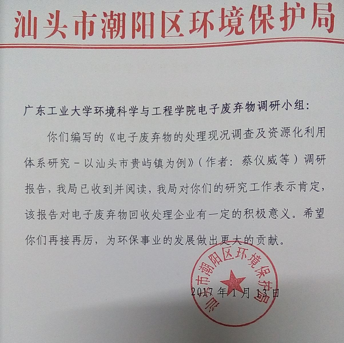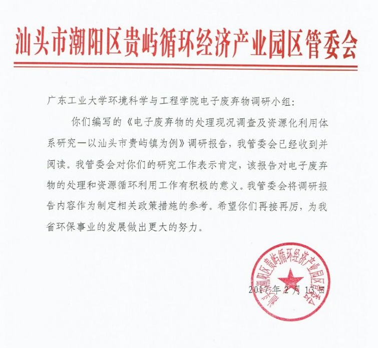 贵屿循环经济产业园区管委会和潮阳区环境保护局还提出应对其他类似企业也进行调研和下一步工作中心可以放在调研电子废弃物来源的合法性上等相关建议。 电子废弃物对环境的影响已成为全球化的问题,我国的形势尤其不容乐观。我国对于电子废弃物的管理及资源利用还处于起步阶段,应建立完备的法律法规监管体系,健全电子废弃物回收利用体系。对电子废弃物处置体系是各国环保专家面临的严峻问题,而电子废弃物无轻污染或无污染回收技术则是电子废弃物资源回收的主要研究方向。作为全国规模较大的电子废弃物处理基地,经过多年的发展,贵屿在电子废弃物处理形成了较为完整的产业链,包括从废弃品收集、贩运、加工、分类、再生等各个环节。如何建立我国的电子废弃物回收处理体系,贵屿镇或许能提供一个很有价值的样本。 最后,贵屿循环经济产业园区管委会和潮阳区环保局对我院电子废弃物调研小组所撰写的《电子废弃物的处理现况调查及资源化利用体系研究——以汕头市贵屿镇为例》(作者:蔡仪威等)调研报告都表示了肯定,认为调研报告具有一定的积极意义,希望我院电子废弃物调研小组再接再厉,为环保事业的发展做出更大的贡献。