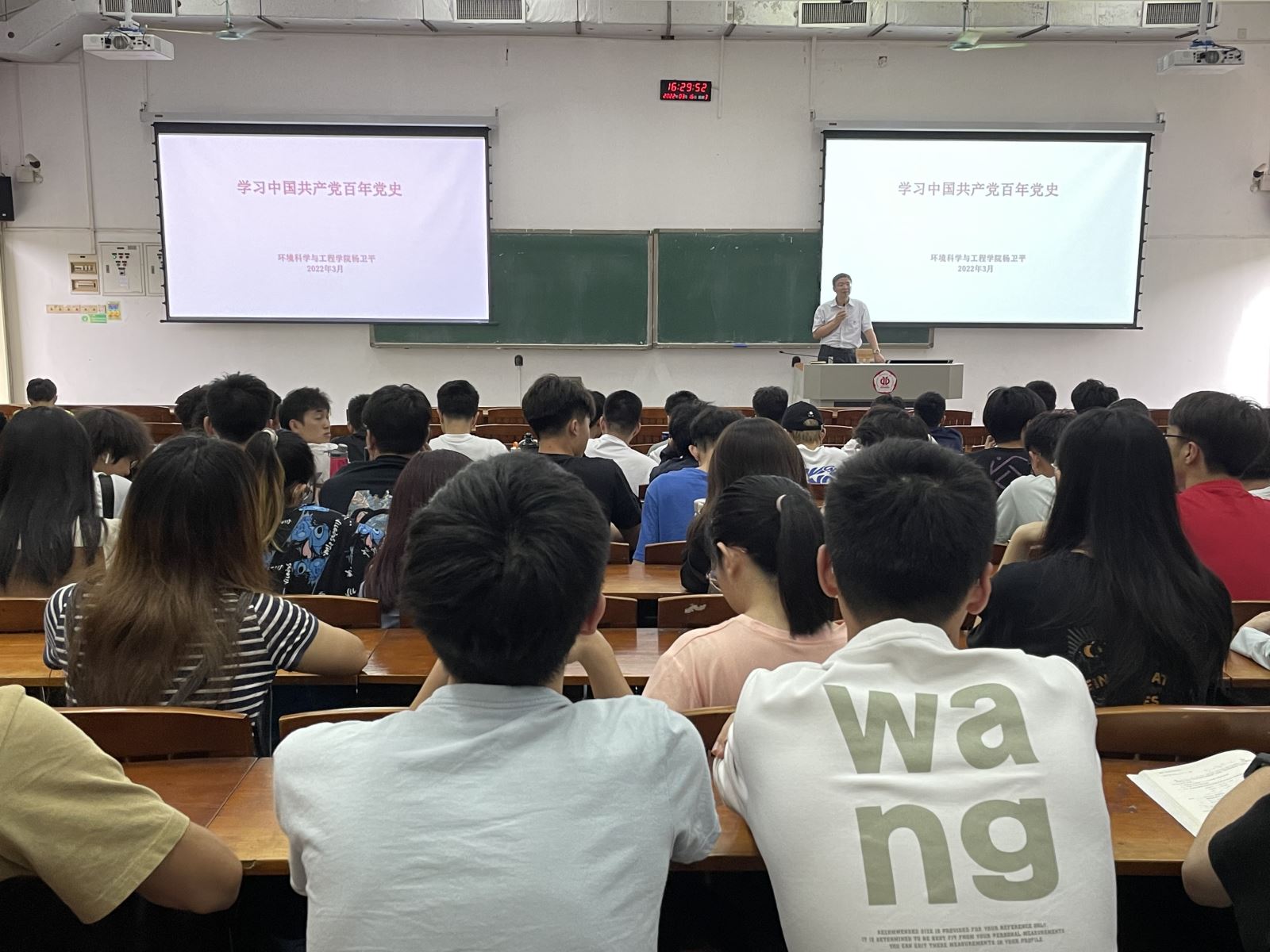 为激励广大学子从百年党史中汲取智慧和力量,听党话、跟党走,以党史之光照亮奋进之路,3月16日下午,学院党委书记杨卫平以“学习中国共产党百年党史”为主题,为2020级全体学生讲授了一场精彩的“思政第一课”。 杨卫平书记带领同学们围绕党史发展的脉络,重温了新民主主义革命时期、社会主义革命和建设时期、改革开放和社会主义现代化建设新时期、中国特色社会主义新时代四个发展阶段的重大历史事件,并讲述了历次全国代表大会的主要任务和历史意义,讲述了党在成长过程中不断探索前进、坚持真理、修正错误,一步一步走向正确发展道路的历史进程。 杨书记总结到,党的一百年是辉煌的一百年,正是因为先辈勇于斗争、敢于牺牲的精神,如今的中国才有了与世界平视的资格。他表示,能否实现下一个百年目标的关键就在于青年一代是否能够肩负起国家的责任。最后,杨书记勉励同学们面对困难和挫折时,停止无意义的唾弃和指责,要勇于面对现实,积极解决问题,坚定拥护中国共产党领导和我国社会主义制度、立志为中国特色社会主义奋斗终生的有用人才。 通过此次“思政第一课”,同学们领会到百年党史的奋斗精神,感悟到马克思主义的理论伟力,筑牢了忠诚捍卫“两个确立”、坚决做到“两个维护”的思想根基。