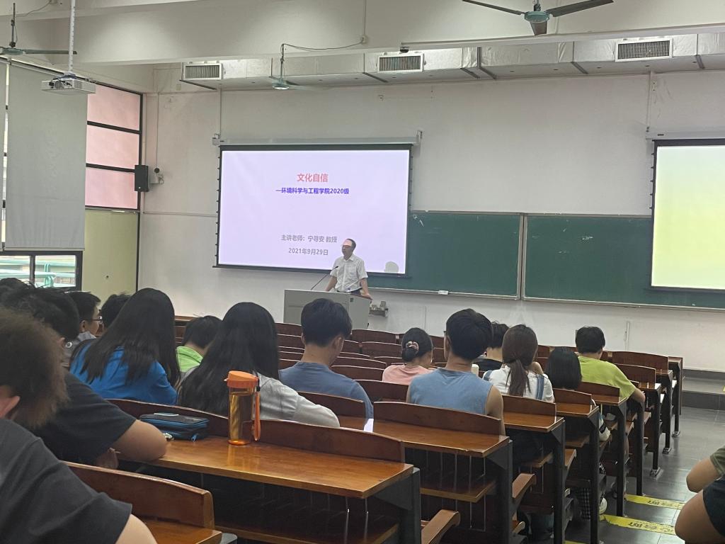 学院院长宁寻安以“文化自信”为主题,以中国优秀历史文化为切入点,运用环境生态学的观点阐释了大学的育人使命、学生的自身成长追求。同时,宁院长从广义的生态系统、中外文化对比等不同的视角解读“文化自信”,指出中华文化的多样性和包容性是中国独特的“和”的文化,引导同学们认同和尊崇中国文化,敬畏自然,永怀一颗热爱学习的心。
