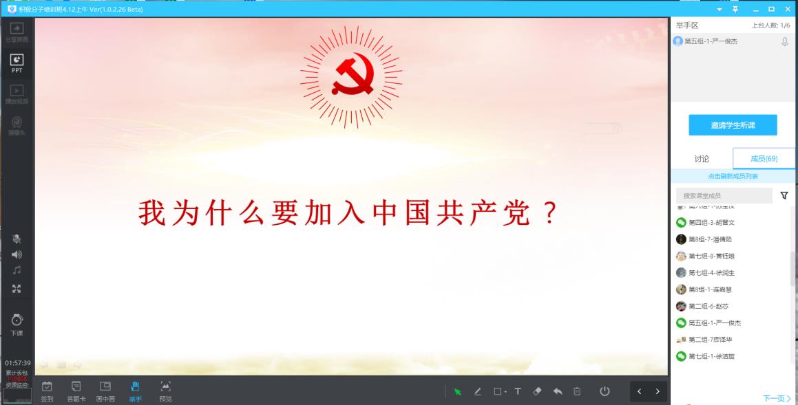 在主题讨论环节,bevictor伟德官网辅导员王永周和党建组织员王晶分别从“我为什么加入中国共产党”,“战‘疫’中青年的责任与担当,青年学生如何以实际行动争取加入中国共产党?”两个话题着手,通过观看视频《中国为什么能?》、《中国人为什么能?》、《中国共产党为什么能?》、电视剧《人民的名义》中陈岩石讲党课片段和《冯秀军:战“疫”里的最美青春——谈中国青年的责任与担当》,并展开小组讨论和线上汇报。2017级环境工程(1)班郑煜认为,入党是心灵的净化,是觉悟的提高,是无私的奉献,是为了提高为人民服务的本领,以更好的姿态回报社会,作为一名积极分子,应该在生活和学习中做好先锋模范作用,用过硬的本领来回应时代的挑战和担当时代的使命,投身志愿活动,用实际行动为社会奉献力量。