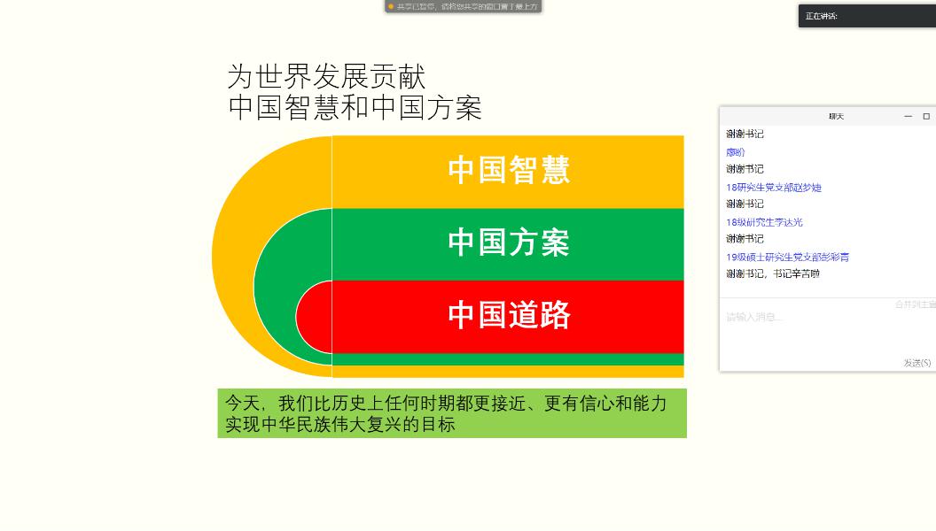 会上,杨书记带领大家学习习近平总书记抗疫的重要讲话精神,以及习近平总书记的抗疫日志,讲述了党中央的正确决策和有力部署。回顾了抗疫历程的时间线,杨书记指出,武汉是英雄的城市,武汉人民是英勇的人民,是值得肯定和学习的。目前抗疫已经取得了阶段性的胜利,相信在党中央的带领下,中国有能力、有信心取得完全的胜利。这正是社会主义制度的优越性,能够集中力量办大事,其他国家是难以模仿的。在抗疫中涌现了一批批无私的白衣战士、英勇的人民子弟兵、默默奉献的社区工作人员,这些都是值得党员同志学习的。杨书记强调党员应提高政治站位,在关键时刻不能站在普通群众的身后,应让党旗在抗疫一线高高飘扬,真正的尽己所能。杨书记指出停课不停学,研究生党员应加强自身学习,遵守网络行为规范,等到春暖花开,疫情胜利,再次相约工学3号馆。
