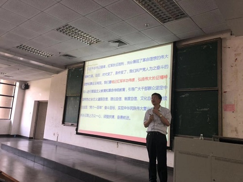 为贯彻落实学校关于做好各学院党组织书记、院长讲授第一堂思想政治理论课的通知要求,推进“大德育”工程,加强我院学生爱国主义教育,弘扬长征精神,2019年9月9日,我院于3号大教室举办了以长征精神为主题的思政课学习。学院党委书记杨卫平、辅导员王永周、詹春耿老师、2018级全体本科生参与了此次学习。此次学习有杨卫平书记主讲。