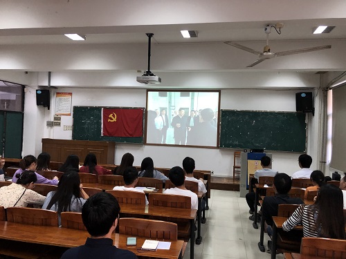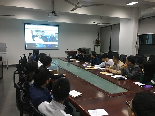 会议伊始,研究生辅导员王永周老师带领全体党员同志,以观看视频的方式,共同学习习近平总书记视察广东重要讲话的内容。在视频中,习近平总书记肯定了广东四十年的发展历程,希望广东认真贯彻新时代中国特色社会主义思想和党的十九大精神,贯彻落实好党中央决策部署,推动思想再解放、改革再深入、工作再落实,并对广东提出了四个要求:深化改革开放、推动高质量发展、提高发展平衡性和协调性、加强党的领导和党的建设。