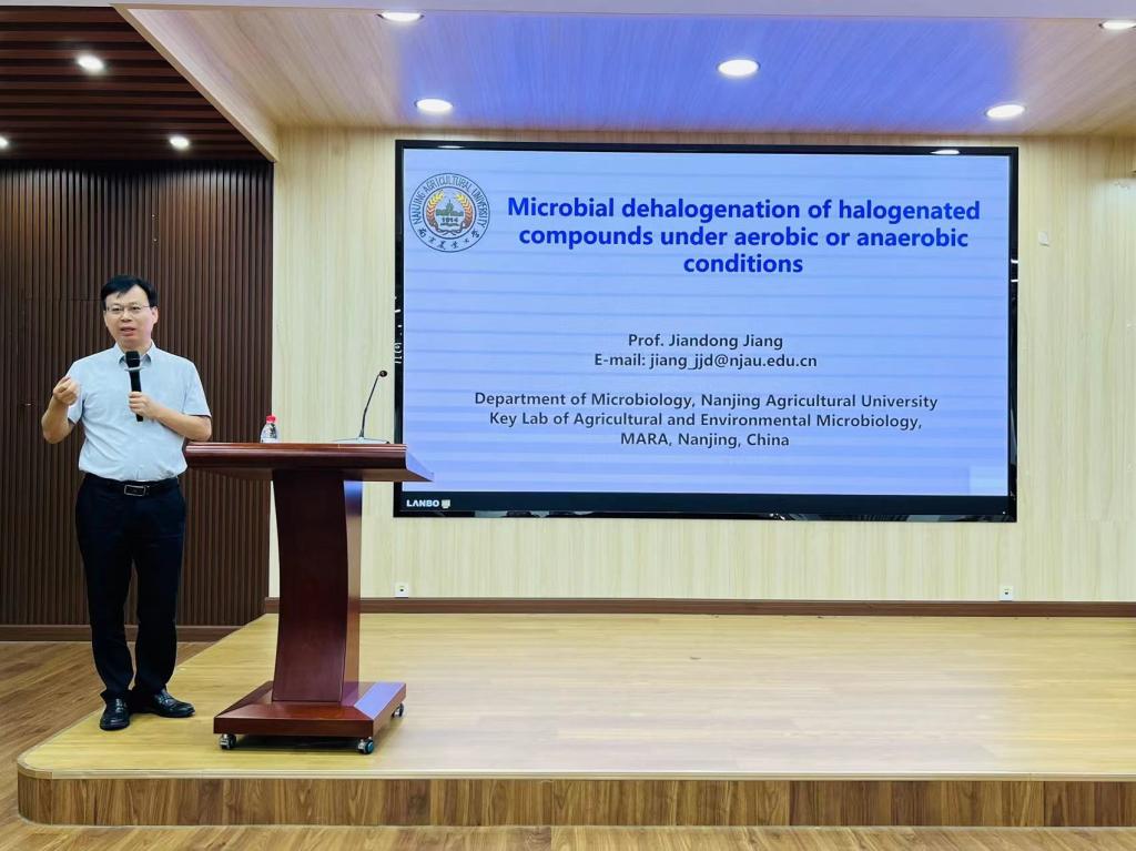 紧接着,南京农业大学生命科学学院院长蒋建东教授就“卤代化合物在厌氧或好氧条件下的脱卤反应”作学术分享。报告中,蒋教授从好氧微生物的水解脱卤和厌氧微生物的还原脱卤协同作用彻底降解百菌清;厌氧微生物菌群的还原脱溴和好氧微生物的氧化开环彻底矿化四溴双酚A进行了讲述。此外,蒋教授还揭示了他们在脱卤呼吸还原脱卤酶基因、过渡型还原脱卤酶基因、代谢型还原脱卤酶基因全球分布及驱动因子相关的进展。