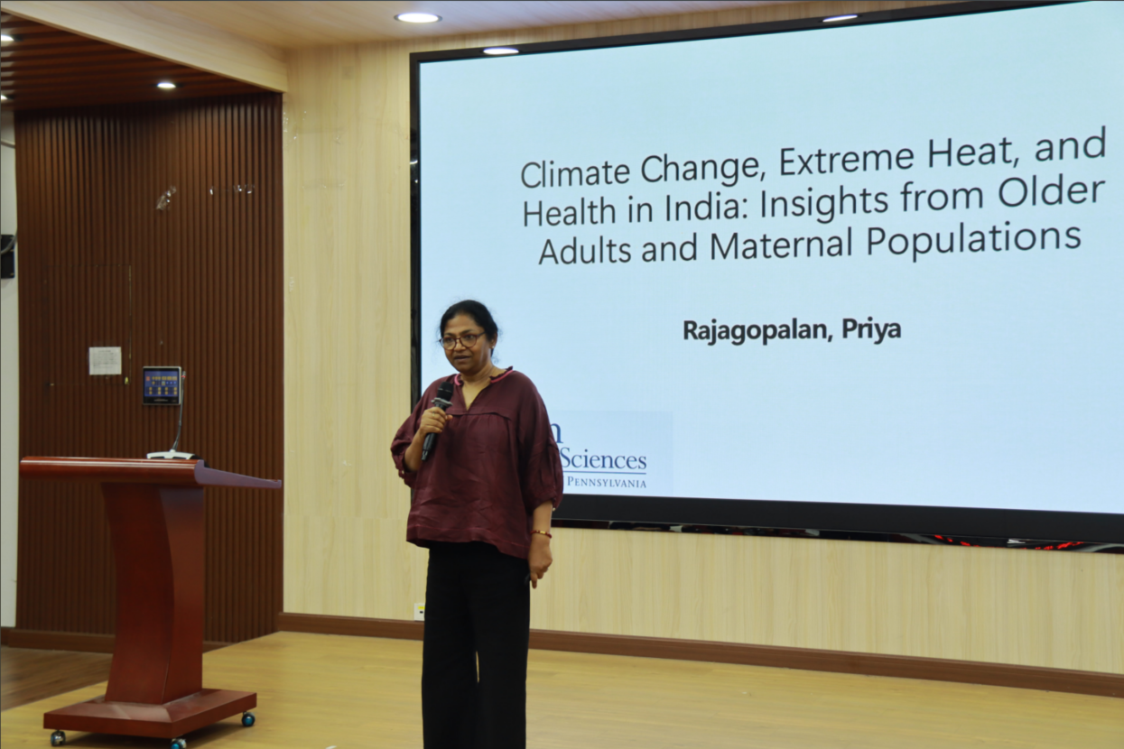 随后,Priya Rajagopalan教授聚焦“高温暴露对印度老年人群健康的影响及应对策略”,带来另一项前沿研究成果。她基于印度纵向老龄化研究第一波数据及美国国家海洋和大气管理局气候数据,深入分析了高温暴露与老年群体健康结果的关联。研究发现,严重高温暴露会显著增加老年人自我报告健康状况恶化的风险(健康状况一般的可能性增加1.1%,健康状况差的可能性增加1.2%),而健康保险在其中起到了调节作用,有效缓解了高温的不良影响。此外,农村地区门诊服务利用率的差异性凸显了制定针对性公共卫生策略的必要性,为应对热浪冲击提供了实证依据。
